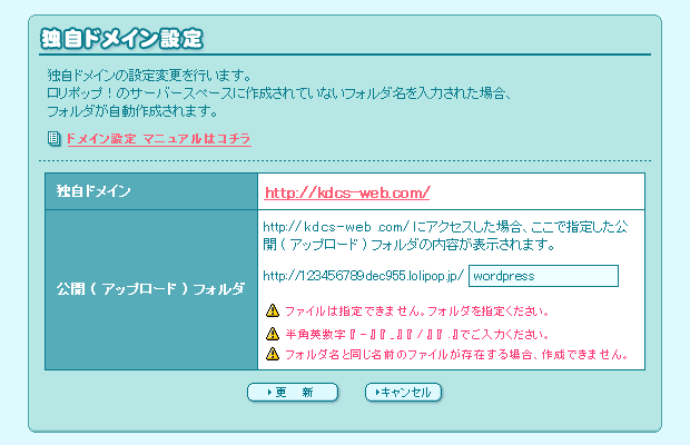 ロリポップのコンパネにログインし、独自ドメイン設定でフォルダを指定する
